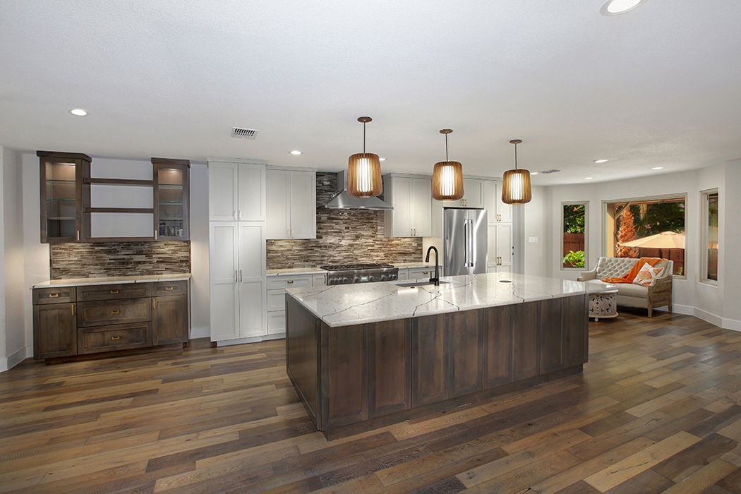 To really appreciate this project you must look at the before pictures. Circa 1980 traditional-style homes created privacy between the kitchen, dining and living spaces. This homeowner loved the location their home was in and felt strongly that they wanted to stay put, but in order to get their desired open-concept feel they needed to open the walls. Included in these images are not only the before pictures but also pictures from during the remodel process. Large structural beams were engineered to allow for the elimination of crossing load-bearing walls to create this amazingly open floorplan. The Orred kitchen, dining and living spaces are now all shared for the ultimate entertaining space.